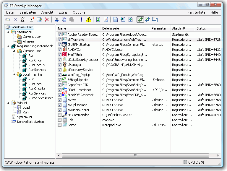 Der EF StartUp Manager ermöglicht Ihnen eine einfache Handhabung und die vollständige Kontrolle über Anwendungen, die während des Systemstarts automatisch ausgeführt werden. Sie können komfortabel neue Programme einfügen, den Start einzelner Programme temporär ausschalten oder nicht mehr gewünschte Einträge endgültig löschen. Darüber hinaus bietet der EF StartUp Manager mit dem so genannten "kontrollierten Startmodus" die Möglichkeit, Programme zeitverzögert in definierter Reihenfolge zu starten. Funktionen zur Sicherung und Wiederherstellung relevanter Teile der Systemregistrierung und zum direkten Starten und Beenden von Anwendungen runden den Funktionsumfang ab.